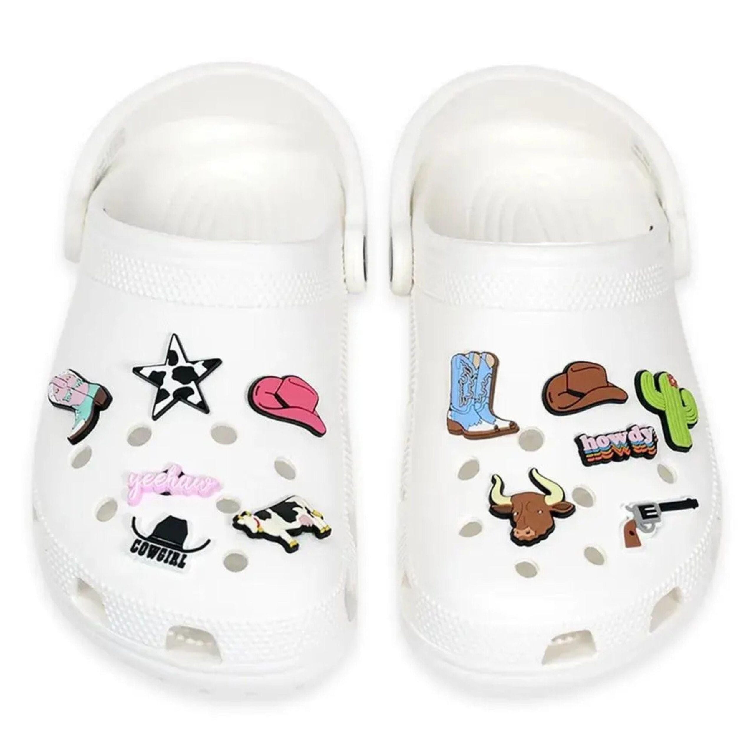 This Western Cowboy Rodeo Shoe Charm bundle is made for those who live and breathe rustic style. Featuring cowboy hats, boots, rodeo gear, stars, and more, this set adds country soul to your clogs, sandals, or sneakers.